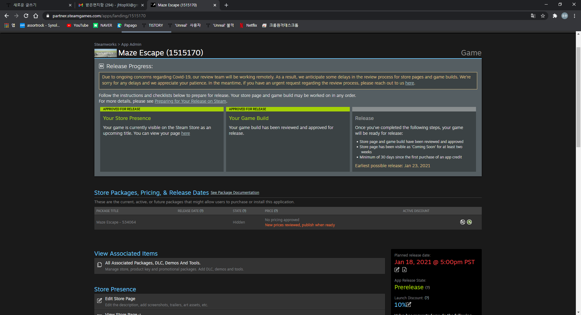 스팀에서 온 메일을 읽어보니, 제가 제공한 라이브러리 로고와 게임 빌드 관련 문제였습니다.